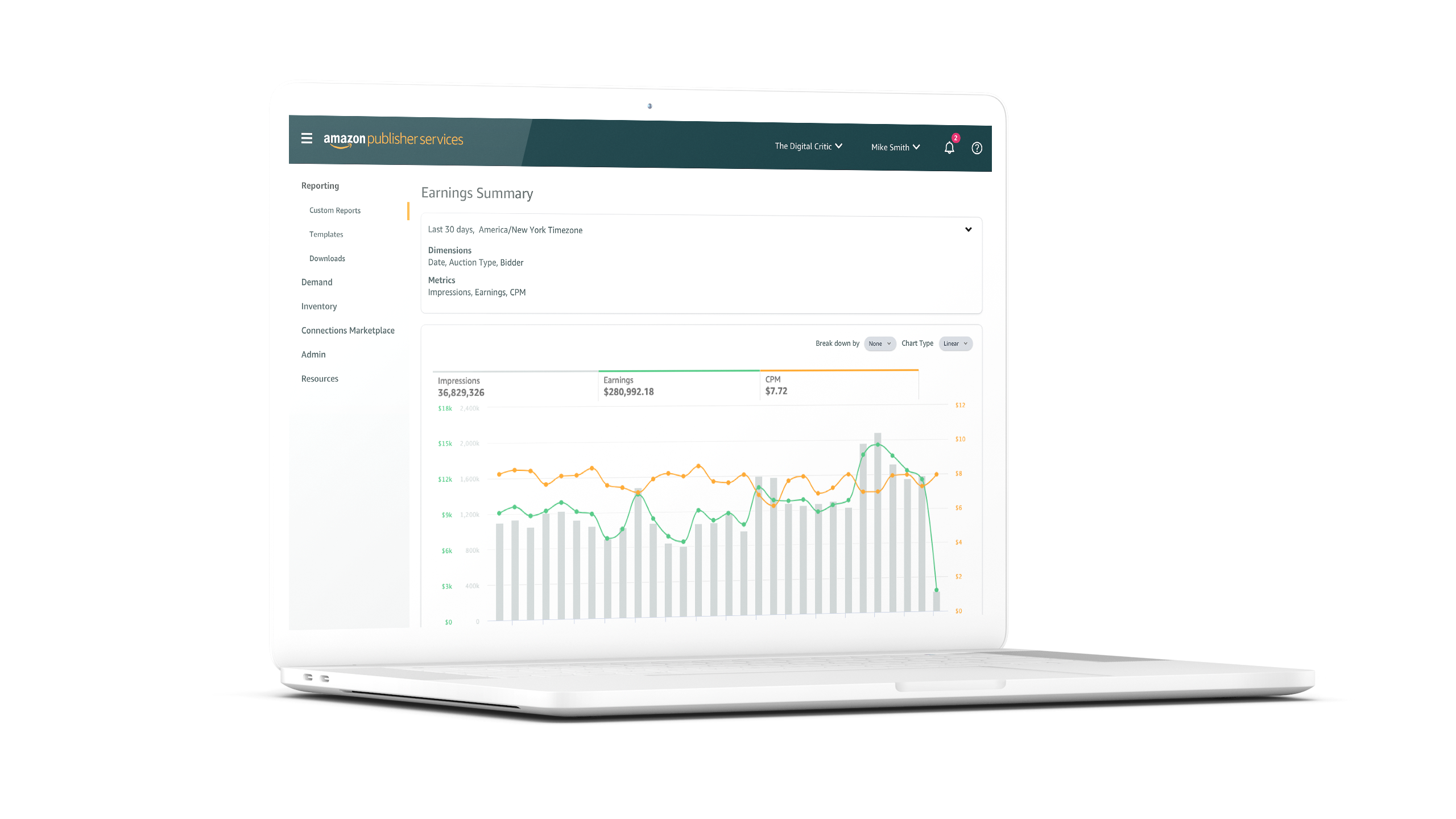 Los reports engloban solicitudes de pujas, impresiones y ganancias con filtros por sitio, emplazamientos publicitarios, tamaños, líneas de precio y dispositivos.